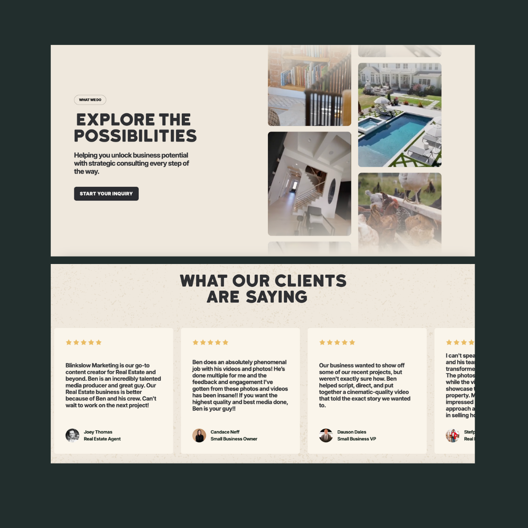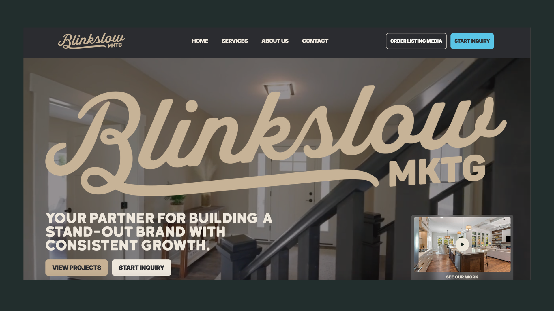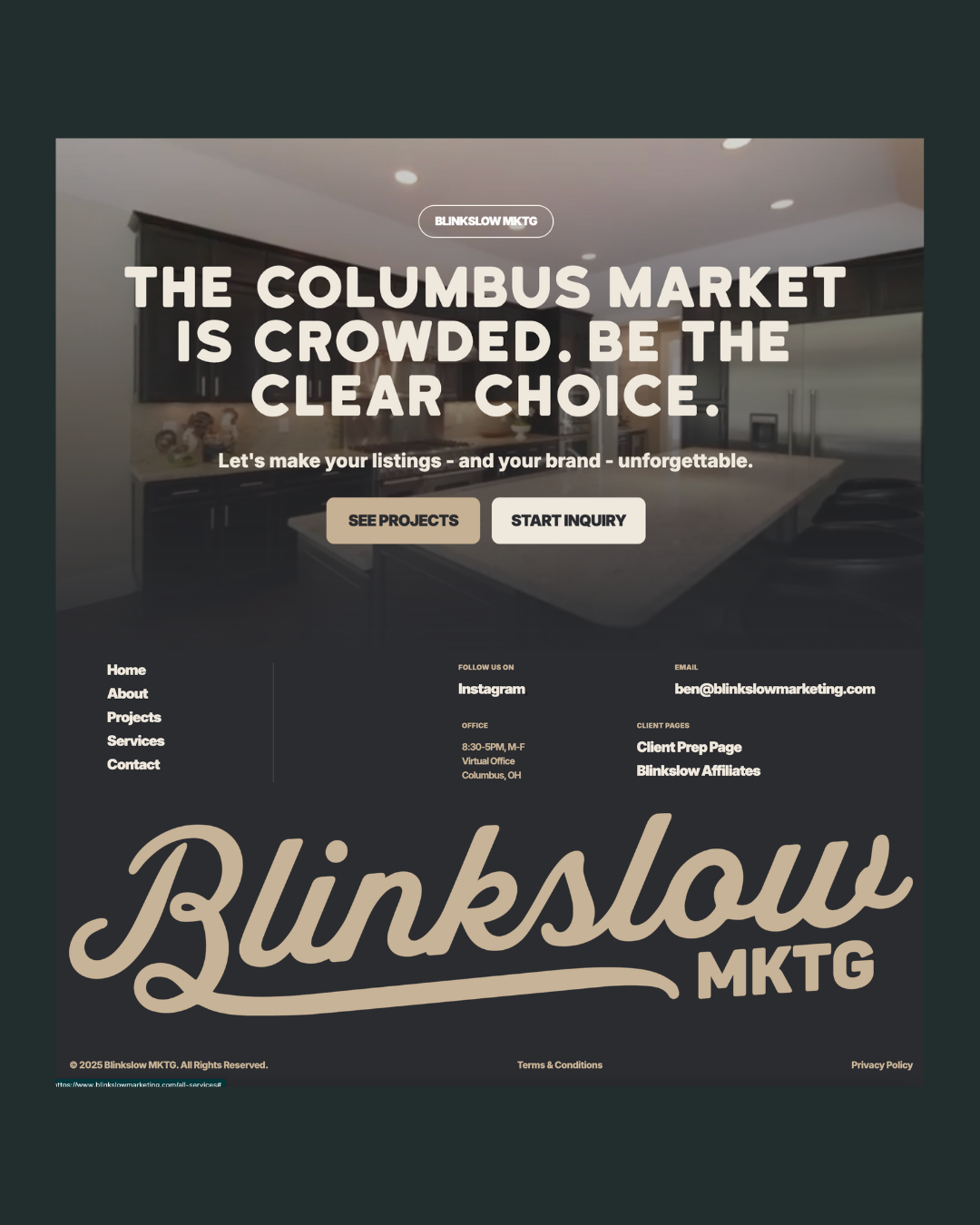 Blinkslow already had a strong visual identity and an unmistakable creative style. The content was elevated, cinematic, and intentionally different from competitors in the real estate marketing space. But online, that energy wasn’t translating. With only a minimal inquiry page, there was little storytelling, no depth, and no opportunity to fully showcase the scope of the work. For a company serving high-end clients, the digital presence needed to build trust immediately and communicate authority before a conversation even began.